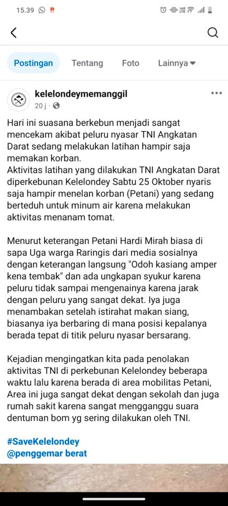 Unggahan itu juga menyinggung penolakan warga terhadap aktivitas latihan TNI di area perkebunan Kelelondey beberapa waktu lalu. Alasannya, lokasi latihan dinilai berdekatan dengan area aktivitas warga, termasuk lahan pertanian, sekolah, dan rumah sakit.